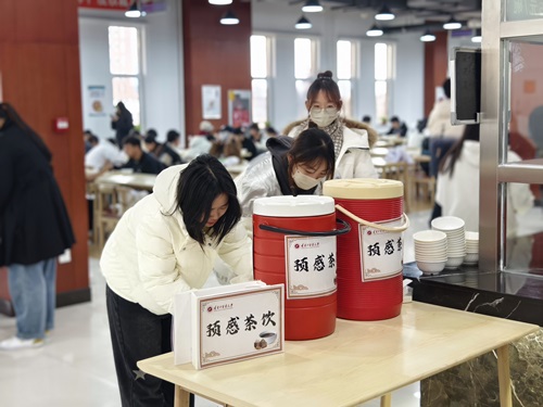 此次預(yù)感茶飲1號(hào)方的發(fā)放,根據(jù)三校區(qū)學(xué)生數(shù)、食堂人流量大小分配給各個(gè)食堂,由食堂工作人員進(jìn)行熬制。每天中午11點(diǎn)30分預(yù)感茶飲會(huì)擺放在食堂人員流動(dòng)較大的位置,供我校師生飲用。