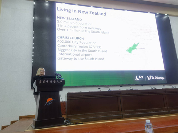 雙方互贈禮品并合影留念。訪問期間,Beth Knowles在學術(shù)報告廳進行了以“Living in New Zealand and Kiwi”為主題的講座,全體護理合作辦學項目的學生參加了講座!代表團一行還參觀了外國專家公寓。Beth Knowles在學術(shù)報告廳進行了以“Living in New Zealand and Kiwi”為主題的講座。