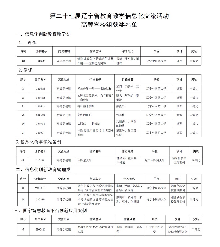 近日,遼寧省教育廳發(fā)布《遼寧省教育廳關(guān)于公布第二十七屆遼寧省教育教學(xué)信息化交流活動評選結(jié)果的通知》,學(xué)校推薦參加交流活動的高等學(xué)校組信息化創(chuàng)新教育教學(xué)類、信息化創(chuàng)新教育管理類和國家智慧教育平臺創(chuàng)新應(yīng)用案例類作品共11件獲獎,其中榮獲一等獎2項、二等獎7項、三等獎2項。