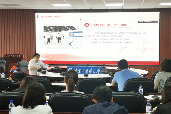 7月14日,按照學(xué)校黨委主題教育工作安排,學(xué)校副校長(zhǎng)戴旭以《有信念 勇?lián)?dāng) 善作為——在國(guó)內(nèi)一流中醫(yī)藥大學(xué)建設(shè)新征程上建新功》為題,通過(guò)線上、線下相結(jié)合的方式,面向所分管工作的各單位、各部門(mén)領(lǐng)導(dǎo)班子成員和科級(jí)以上黨員干部及普通黨員講授主題教育專(zhuān)題黨課。