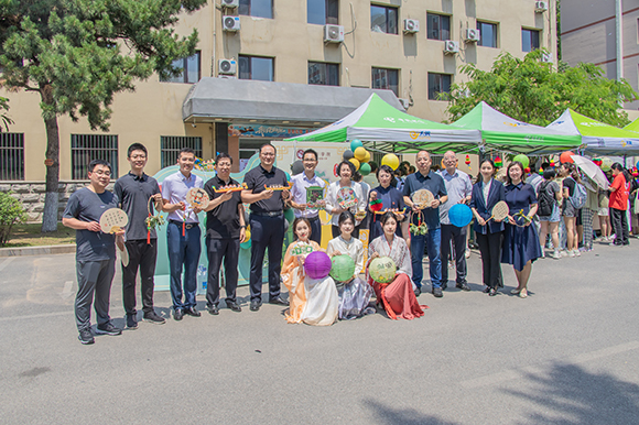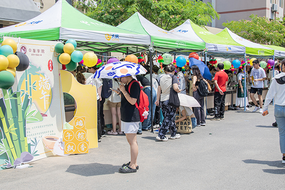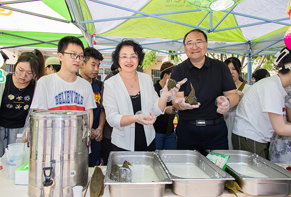 本次活動設置了端午“粽”動員、“乾坤一擲”投壺大賽、端午知識問答、手繪扇面、DIY龍舟拼圖、夏日冰飲季、古箏表演和制作艾草花環(huán)等項目,活動現(xiàn)場氣氛熱烈,約有上千名同學參與其中,炎炎夏日也擋不住同學們的參與熱情。每一個項目都有同學在有序排隊參與,現(xiàn)場還有身著學位服的畢業(yè)生同學打卡留念,留下對母校的深深祝福,記錄美好的校園回憶;食堂主廚現(xiàn)場指導,洗好的糯米、泡好的粽葉和各種餡料已準備齊全,白米粽、蜜棗粽、蛋黃粽、肉粽等各色各樣的粽子讓人大飽口福;現(xiàn)場同學一起編織五彩繩,用自己獨特的編結(jié)技法,編織出一系列精美的作品;學院老師現(xiàn)場手繪團扇,將可愛的圖案與美好的祝福繪于扇面之上,送給幸運的同學。學校領導與現(xiàn)場同學一起包粽子、品涼茶、編五彩繩、拼龍舟拼圖、制作艾草花環(huán),大家其樂融融,共同感受傳統(tǒng)節(jié)日氛圍。學院還為參與活動的同學準備了粽子、雞蛋、香囊、小葫蘆、五彩繩等端午小禮品,師生共同迎接端午佳節(jié)。