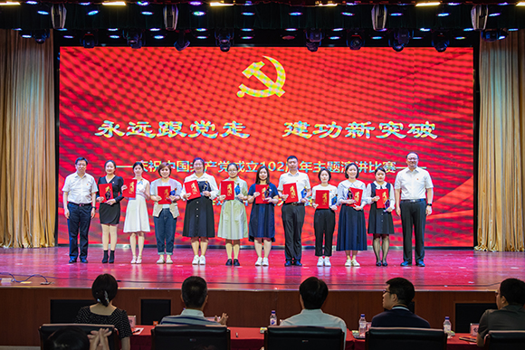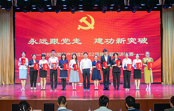 為慶祝中國共產(chǎn)黨成立102周年,扎實推進學(xué)習(xí)貫徹習(xí)近平新時代中國特色社會主義思想主題教育走深走實,6月21日,學(xué)校舉行了“永遠跟黨走 建功新突破”主題演講比賽決賽,黨委書記呂曉東、副校長劉繼東、副校長戴旭出席比賽并為獲獎教師頒獎。遼寧大學(xué)黨委宣傳部部長吳濟龍,沈陽理工大學(xué)外國語學(xué)院黨委書記劉東升,東北大學(xué)黨委宣傳部副部長史鑒,沈陽化工大學(xué)黨委宣傳部副部長兼新聞中心副主任劉珊珊,沈陽航空航天大學(xué)黨委宣傳部、統(tǒng)戰(zhàn)部副部長包建擔(dān)任比賽評委。學(xué)校各分黨委、黨總支、直屬黨支部近500名師生觀看了比賽。