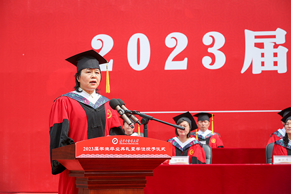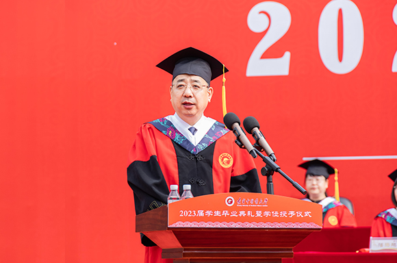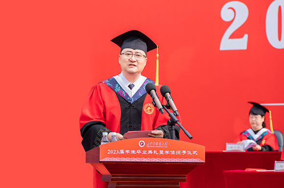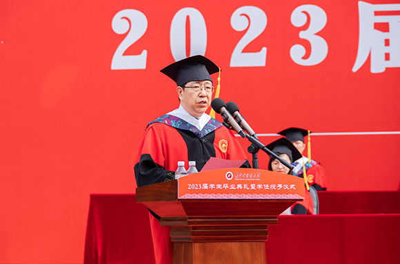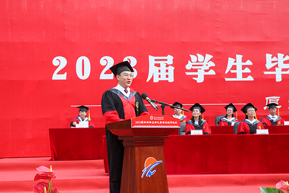 6月26日,學(xué)校2023屆學(xué)生畢業(yè)典禮暨學(xué)位授予儀式在學(xué)校操場(chǎng)隆重舉行。學(xué)校黨委書記、學(xué)位評(píng)定委員會(huì)主席呂曉東,紀(jì)委書記張錦徽,副校長(zhǎng)劉繼東,副校長(zhǎng)戴旭,校友代表李永明及校學(xué)位評(píng)定委員會(huì)委員,研究生導(dǎo)師,機(jī)關(guān)各部處、各學(xué)院領(lǐng)導(dǎo),教師代表,2963名畢業(yè)生參加典禮。700余名學(xué)生家長(zhǎng)受邀到場(chǎng)見證畢業(yè)生撥穗正冠的喜悅時(shí)刻。