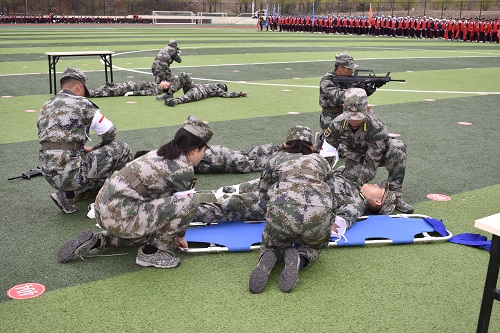 戰(zhàn)地救援演習(xí)由我校教官團(tuán)扮演的中國人民解放軍突擊小隊(duì),在無人機(jī)的預(yù)先偵查后,模擬與敵軍對抗的戰(zhàn)術(shù)背景下,迅速移動(dòng)至作戰(zhàn)地域,并針對患開放性氣胸等傷員進(jìn)行緊急醫(yī)療救治與轉(zhuǎn)運(yùn)的場景,演示接敵、突入、營救、阻敵、撤離等內(nèi)容。