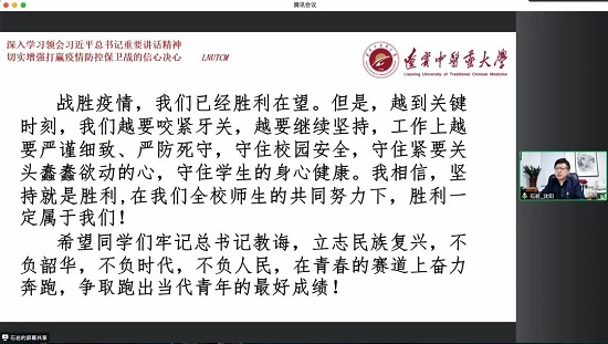 石巖代表學(xué)校黨委感謝每位同學(xué)對學(xué)校各項防疫政策的理解、配合與支持。同時鼓勵遼寧中醫(yī)學(xué)子,在中醫(yī)藥事業(yè)迎來天時、地利、人和的大好時機,要秉承“厚德博學(xué)、繼承創(chuàng)新”的校訓(xùn)精神,弘揚偉大抗疫精神,傳承精華、守正創(chuàng)新。