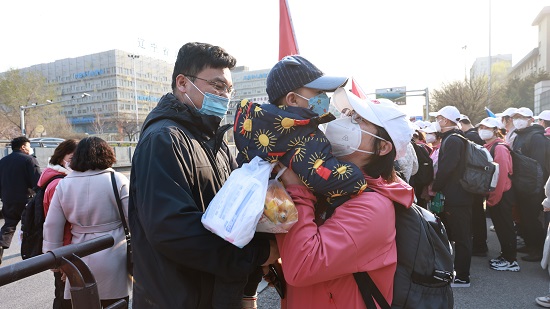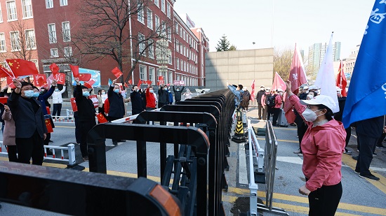 出征儀式現(xiàn)場,封閉在校的師生員工在校門內(nèi)揮舞著國旗,齊聲高呼著“共同守滬、平安凱旋”的響亮口號,來往的市民行人駐足觀看,自發(fā)加入隊伍為醫(yī)療隊送行。
