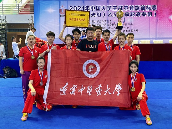 2021年中國大學(xué)生武術(shù)套路錦標(biāo)賽于7月8日在河北省遷安市唐山九江體育中心落下帷幕,本次賽事由來自全國92所高校的500余名大學(xué)生運動員參加。經(jīng)學(xué)校嚴格選拔,派出10名武術(shù)隊成員參賽,體育部主任王曉松擔(dān)任領(lǐng)隊,教師李岳擔(dān)任教練員,經(jīng)過頑強拼搏,最終,我校運動健兒勇奪7金4銀5銅并歷史性的取得甲A組男子團體總分第一名的好成績。