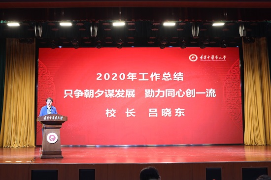 校長呂曉東對學(xué)校2020年工作做了全面總結(jié)。她指出,2020年學(xué)校堅持以習(xí)近平新時代中國特色社會主義思想為指導(dǎo),緊緊圍繞“立德樹人”根本任務(wù),圓滿地完成全年工作任務(wù),推進(jìn)了學(xué)校高質(zhì)量發(fā)展和進(jìn)步。她代表學(xué)校向為學(xué)校發(fā)展付出辛勤汗水的全校師生員工表示衷心的感謝!她從以習(xí)近平新時代中國特色社會主義思想武裝頭腦,統(tǒng)籌推進(jìn)學(xué)校黨建和思想政治工作;傳承精華、守正創(chuàng)新,不斷提升內(nèi)涵建設(shè)水平;發(fā)揮中醫(yī)藥特色優(yōu)勢,疫情防控工作成績凸顯等多方面總結(jié)了2020年學(xué)校工作取得的主要成績,并對學(xué)校2021年的工作提出了希望,要求全校師生認(rèn)真貫徹黨的十九屆五中全會精神,堅持新發(fā)展理念,全面提升學(xué)校核心競爭力,為學(xué)?!笆奈濉遍_好局、起好步,以“中醫(yī)精誠精神”“五行和諧之象”“改革創(chuàng)新之筆”譜寫學(xué)校事業(yè)發(fā)展的新華章!