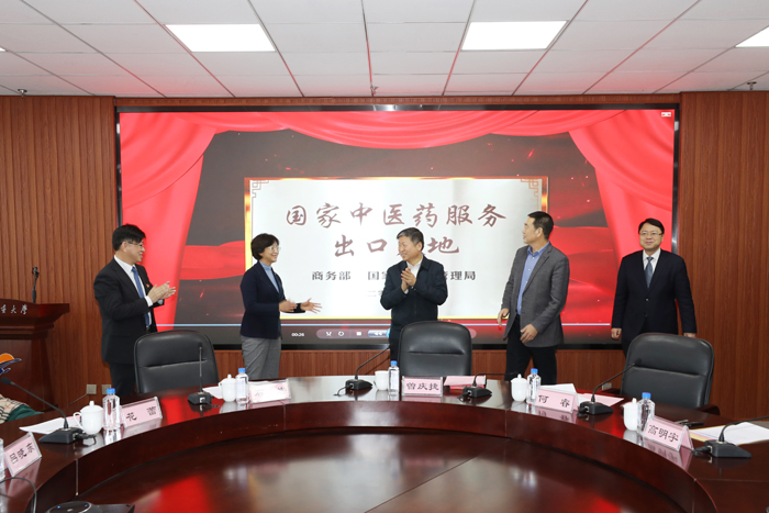 12月31日,學(xué)校舉辦國(guó)家中醫(yī)藥服務(wù)出口基地揭牌儀式,遼寧省教育廳副廳長(zhǎng)花蕾,遼寧省商務(wù)廳副廳長(zhǎng)何睿,遼寧省衛(wèi)健委副主任、遼寧省中醫(yī)藥管理局局長(zhǎng)高明宇,遼寧省教育廳農(nóng)林醫(yī)藥高等教育處副處長(zhǎng)劉彤,遼寧省商務(wù)廳住宿業(yè)與服務(wù)貿(mào)易處處長(zhǎng)王昱萍、遼寧省中醫(yī)藥管理局處長(zhǎng)李丹、學(xué)校黨委書記曾慶捷、校長(zhǎng)石巖、黨委副書記呂曉東、紀(jì)委書記張洪新出席會(huì)議。學(xué)校正處級(jí)領(lǐng)導(dǎo)參加儀式。儀式由石巖主持。