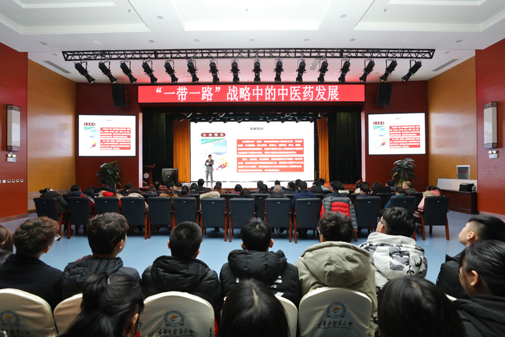 12月5日,校長石巖為學(xué)生上“形勢(shì)與政策”課,系統(tǒng)地為學(xué)生講解了“一帶一路”倡議中的中醫(yī)藥發(fā)展。宣傳統(tǒng)戰(zhàn)部部長周健、團(tuán)委書記李睿、研究生學(xué)院黨總支書記王飛、學(xué)生處副處長劉英佶、信息工程學(xué)院副院長劉廣、外國語學(xué)院副院長潘海鷗、各學(xué)院輔導(dǎo)員以及600名學(xué)生代表共同聆聽了一堂意義深遠(yuǎn)的“形勢(shì)與政策”課。