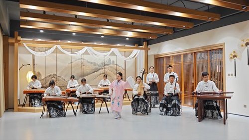 來自民樂與器樂實踐工作坊的同學(xué)們通過古箏、二胡、琵琶等器樂,共同演奏了一曲《蘭亭序》。