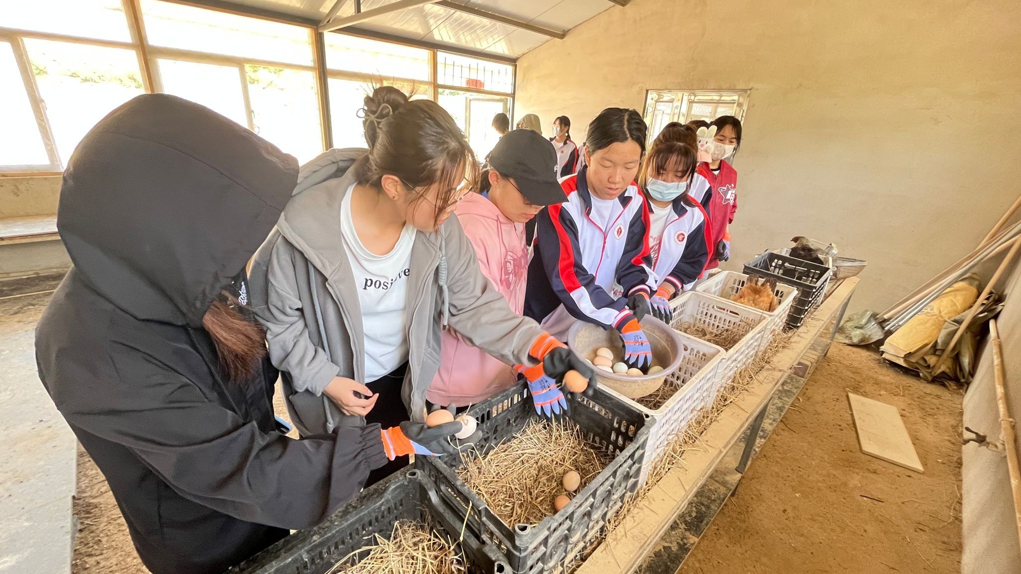 此次勞動教育實踐活動的主要內(nèi)容是田間除草及家禽喂養(yǎng),同學們在工作人員的指導下,有序分為兩組,一組到種植區(qū)除草,另一組到家禽區(qū)給雞、鵝添水和飼料,并跟隨飼養(yǎng)員一起拾取雞蛋,同學們熱情高漲,全程沉浸在勞動的喜悅之中。