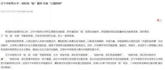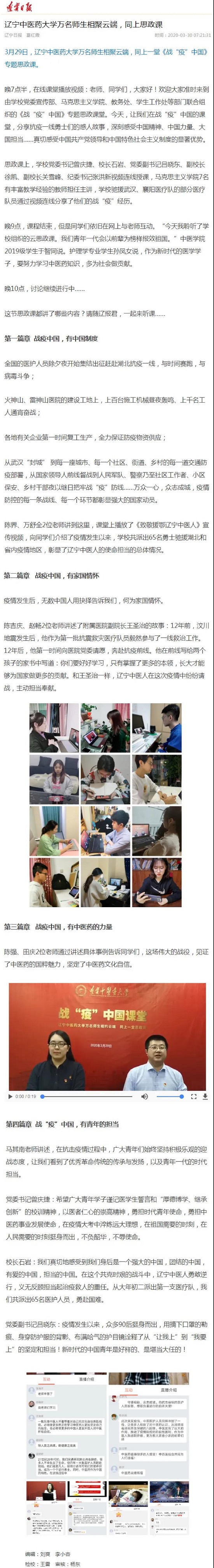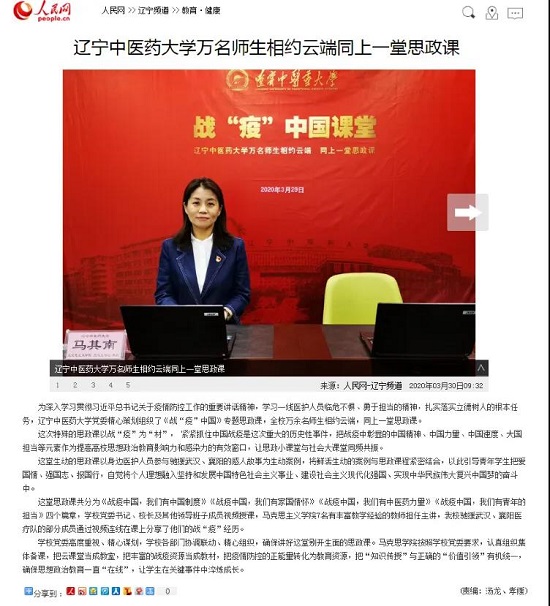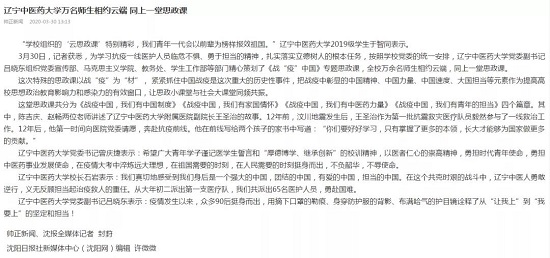 3月29日19:30,全校萬(wàn)余名師生相約云端,同上一堂思政課。廣大師生積極留言、熱切談?wù)摚?.5萬(wàn)余人點(diǎn)贊。人民網(wǎng)、光明日?qǐng)?bào)、遼寧日?qǐng)?bào)、沈陽(yáng)日?qǐng)?bào)、中國(guó)焦點(diǎn)在線、遼寧大學(xué)生在線聯(lián)盟、云盛京、二三里資訊等多家媒體進(jìn)行了深入采訪報(bào)道,對(duì)這次網(wǎng)絡(luò)思政課給予了高度評(píng)價(jià)。