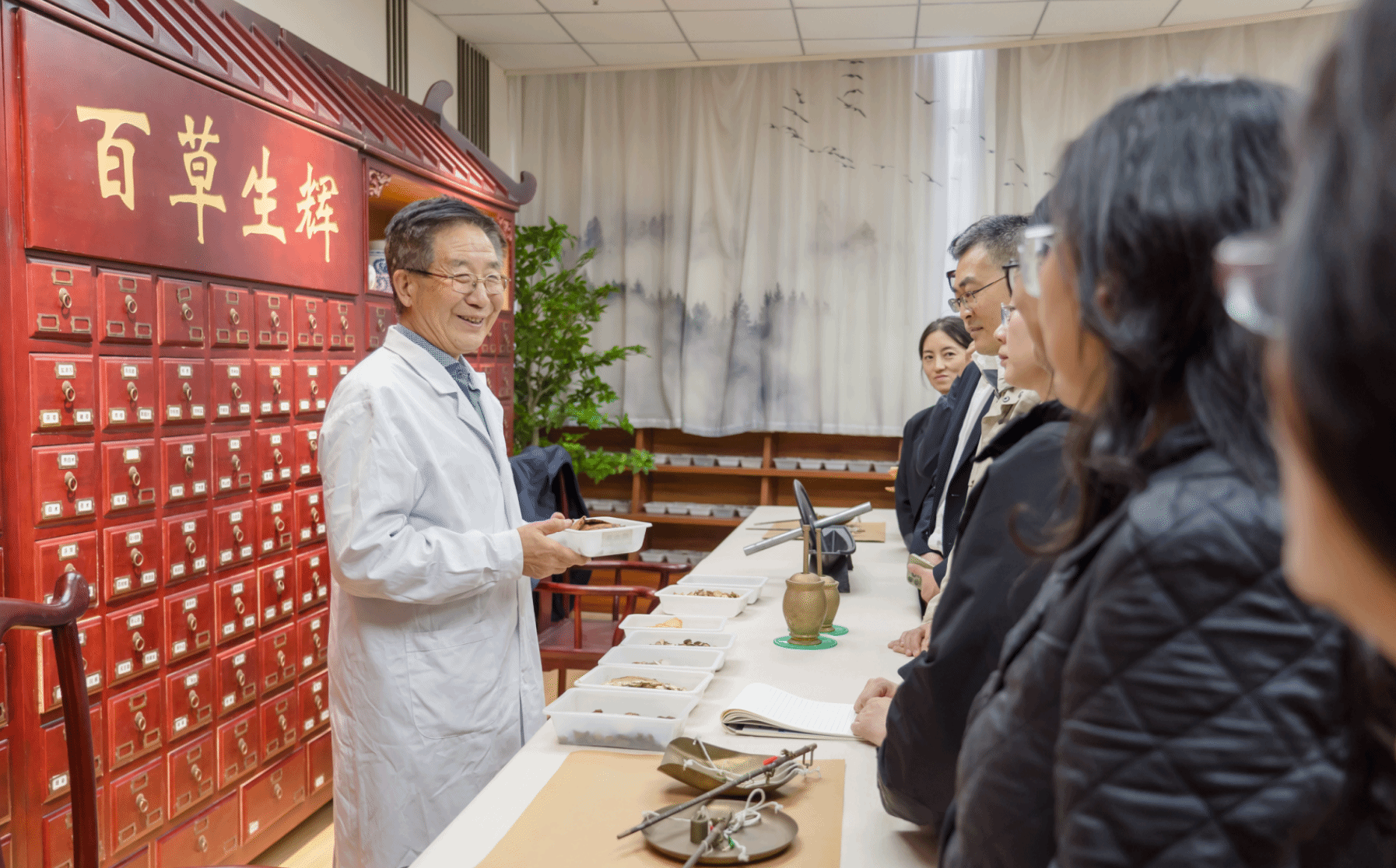 當(dāng)日下午舉辦中藥辨狀論質(zhì)特色技術(shù)培訓(xùn)會(huì),為與會(huì)者帶來了一場(chǎng)中藥傳統(tǒng)知識(shí)與實(shí)踐技能的盛宴??低淌谧髁恕吨兴幈鏍钫撡|(zhì)理論的傳承與發(fā)展》專題報(bào)告,系統(tǒng)梳理了中藥鑒定學(xué)科的理論基礎(chǔ)與實(shí)踐精髓。在技藝傳承室,向傳承人傳授了通過眼看、手摸、鼻聞等傳統(tǒng)鑒別方法,對(duì)常用中藥進(jìn)行“辨狀論質(zhì)”的特色技術(shù),同時(shí)圍繞人參的歷史沿革與文化內(nèi)涵進(jìn)行講解??低淌谝浴芭]蚓瘛泵銊?lì)全體傳承人耐住寂寞、深耕事業(yè),傳承好老藥工的衣缽與匠心。