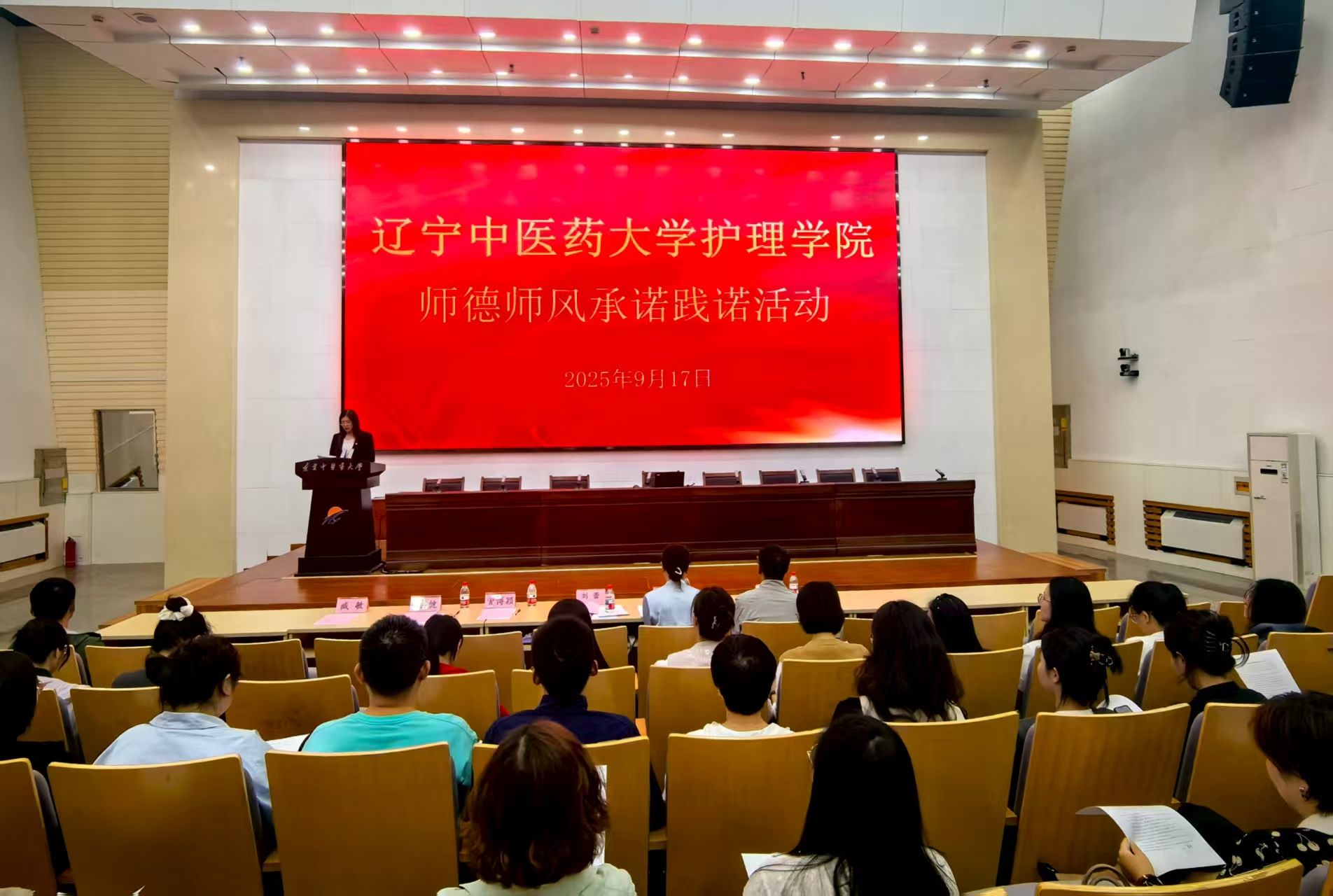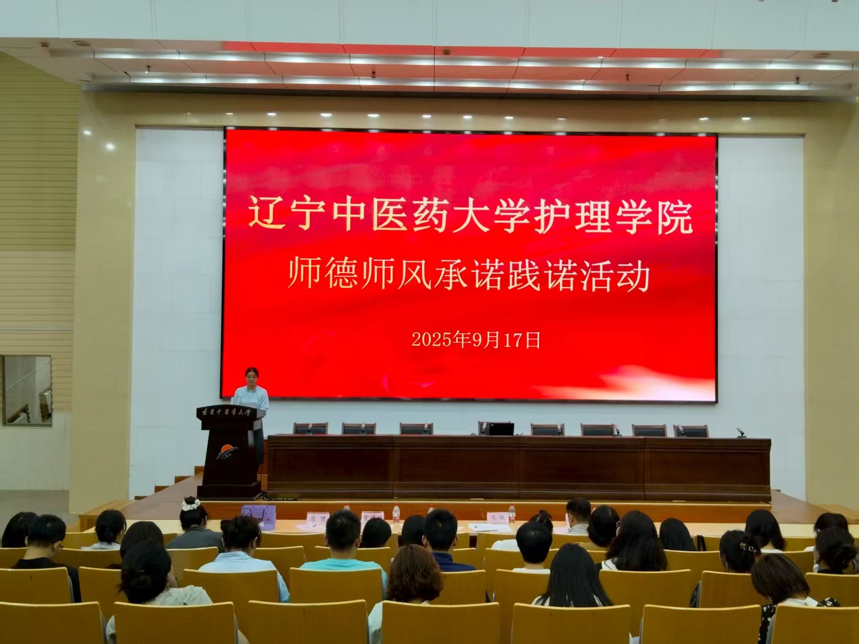 會(huì)上,護(hù)理學(xué)院院長(zhǎng)劉蕾深刻闡述了開展師德師風(fēng)承諾踐諾工作的重要意義,強(qiáng)調(diào)了師德師風(fēng)建設(shè)的核心地位。隨后,教師代表鄭方遒同志上臺(tái)領(lǐng)誓,全體教職工肅立,共同許下恪守師德、潛心育人的鄭重承諾。