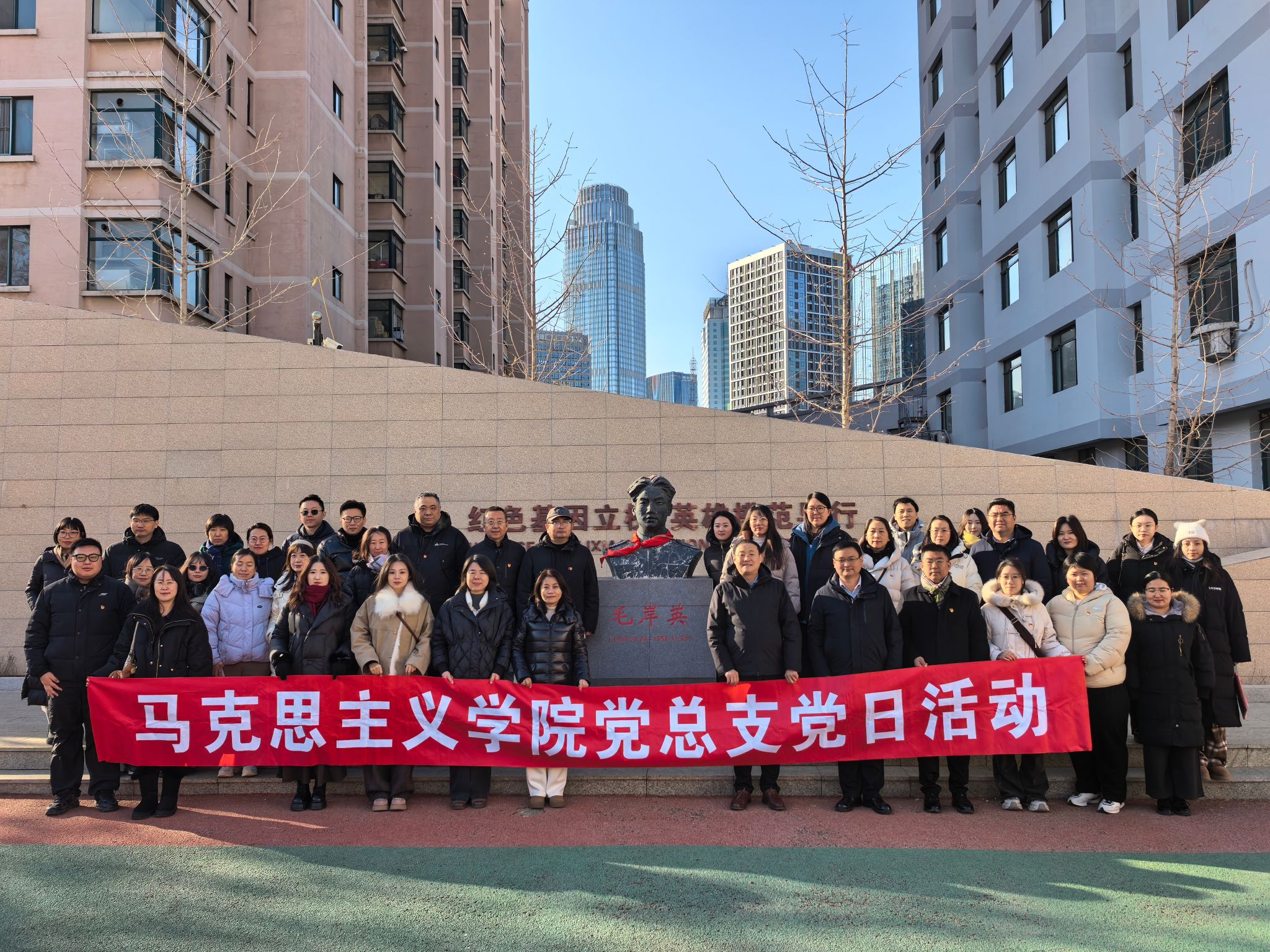馬克思主義學院黨員來到操場,瞻仰岸英像、輕撫岸英樹。隨后,黨員們走進岸英文化館,在翔實的史料、珍貴的圖片和生動的實物面前,系統(tǒng)了解毛岸英同志英雄事跡?;顒又校队⑿W黨支部書記王丙利致辭,介紹了學校依托紅色資源開展黨建工作和思政教育的經(jīng)驗做法。學校思政課教師董玲玲講授黨課,深刻闡釋了以人民為中心的發(fā)展思想。最后,馬克思主義學院黨總支書記徐曉東作總結講話。他指出,本次聯(lián)合黨日活動是校際黨建聯(lián)動的生動實踐,既搭建了交流互鑒的平臺,又推動了紅色基因的傳承與育人使命的踐行,希望以此次活動為契機,進一步深化雙方合作,共同探索大中小學思政教育一體化建設新路徑,為培養(yǎng)擔當民族復興大任的時代新人貢獻力量。