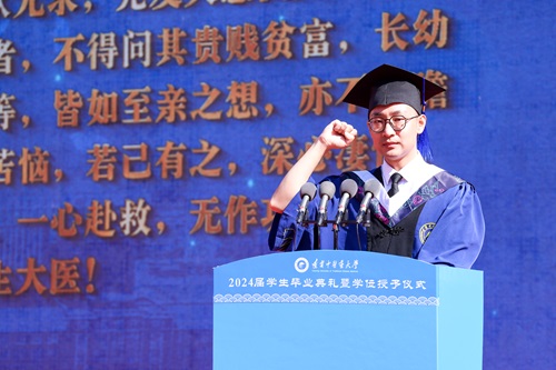 博士研究生王佳然代表全體畢業(yè)生發(fā)言,表示在未來將不斷傳播中醫(yī)聲音、講好中醫(yī)故事,做心中有魂、腳下有根的新時代中醫(yī)青年。