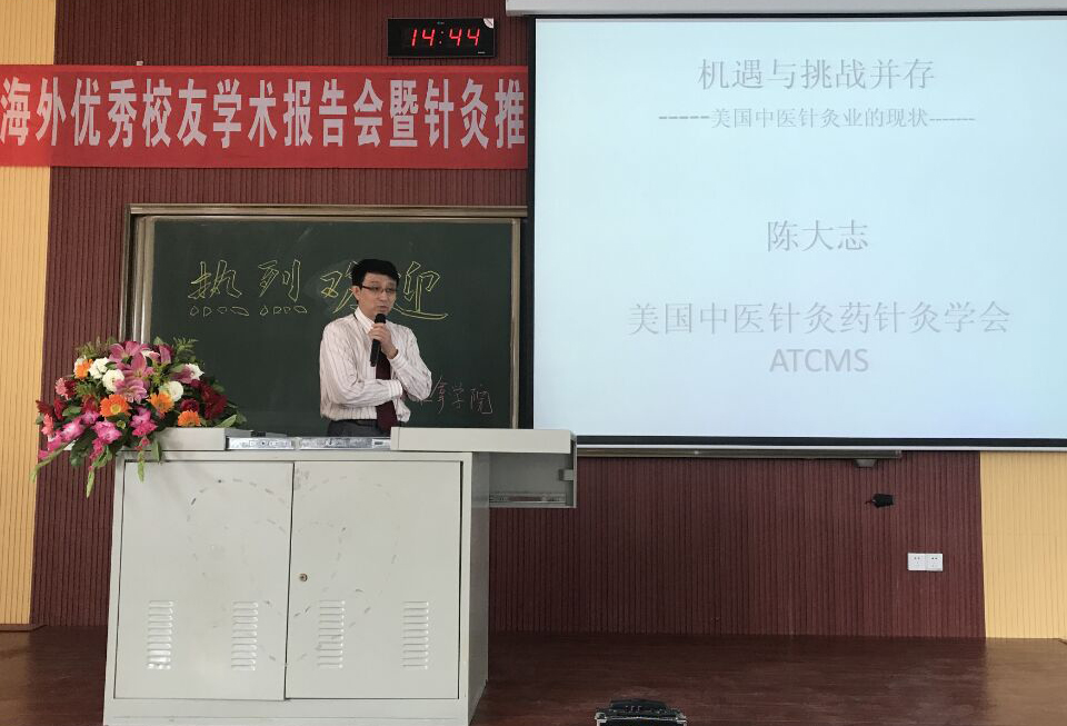 9月21日,針灸推拿學(xué)院舉行了海外優(yōu)秀校友學(xué)術(shù)報(bào)告會(huì)暨第九次青年教師學(xué)術(shù)沙龍活動(dòng)。本次活動(dòng)主題為《機(jī)遇與挑戰(zhàn)并存——美國(guó)中醫(yī)針灸業(yè)的現(xiàn)狀》,主講人陳大志,日本京都府立醫(yī)科大學(xué)博士,美國(guó)北岸醫(yī)學(xué)院博士后、研究員,學(xué)校77級(jí)中醫(yī)系校友,現(xiàn)任美國(guó)紐約州中醫(yī)藥針灸學(xué)會(huì)會(huì)長(zhǎng)?;顒?dòng)由學(xué)院院長(zhǎng)馬鐵明主持,副院長(zhǎng)樊旭、各教研室主任、教授、全體青年教師及針灸推拿專業(yè)、康復(fù)治療學(xué)專業(yè)學(xué)生及兄弟院系青年老師近200人參加了會(huì)議。