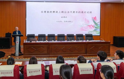 曲建武教授授課主題為《在青春的賽道上跑出當(dāng)代青年的最好成績》,從熱愛祖國、熱愛中國共產(chǎn)黨、堅定理想信念、提升思想力、為實現(xiàn)中國夢刻苦學(xué)習(xí)、培養(yǎng)剛毅堅卓的品格、懂得感恩、培養(yǎng)團(tuán)隊精神、遵紀(jì)守法、強(qiáng)身健體十個方面提出了切實可行的方法和路徑。